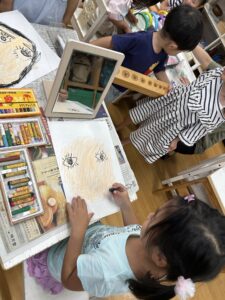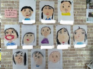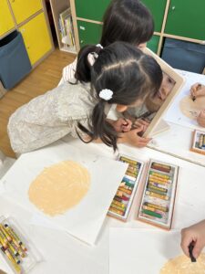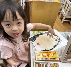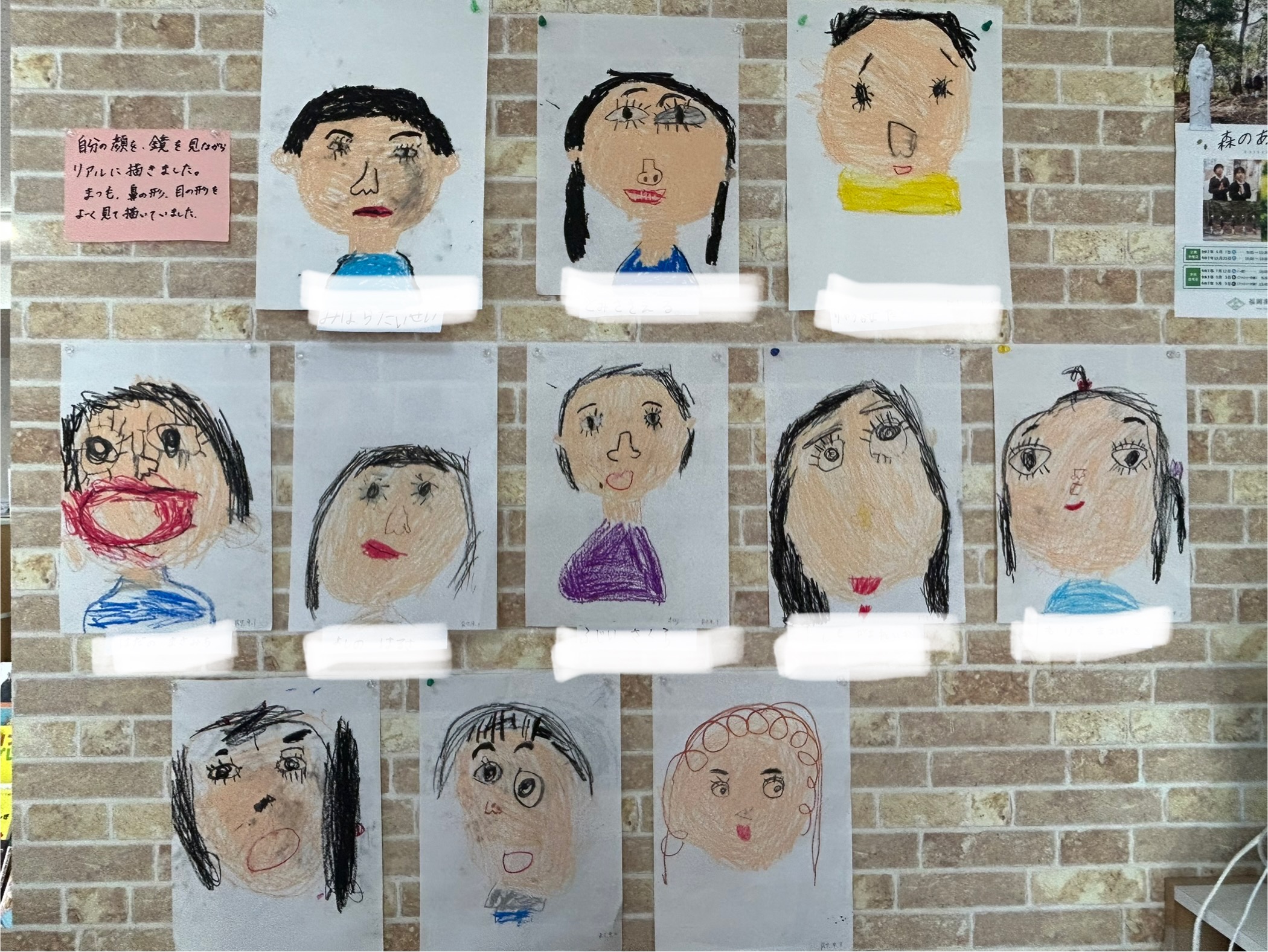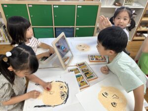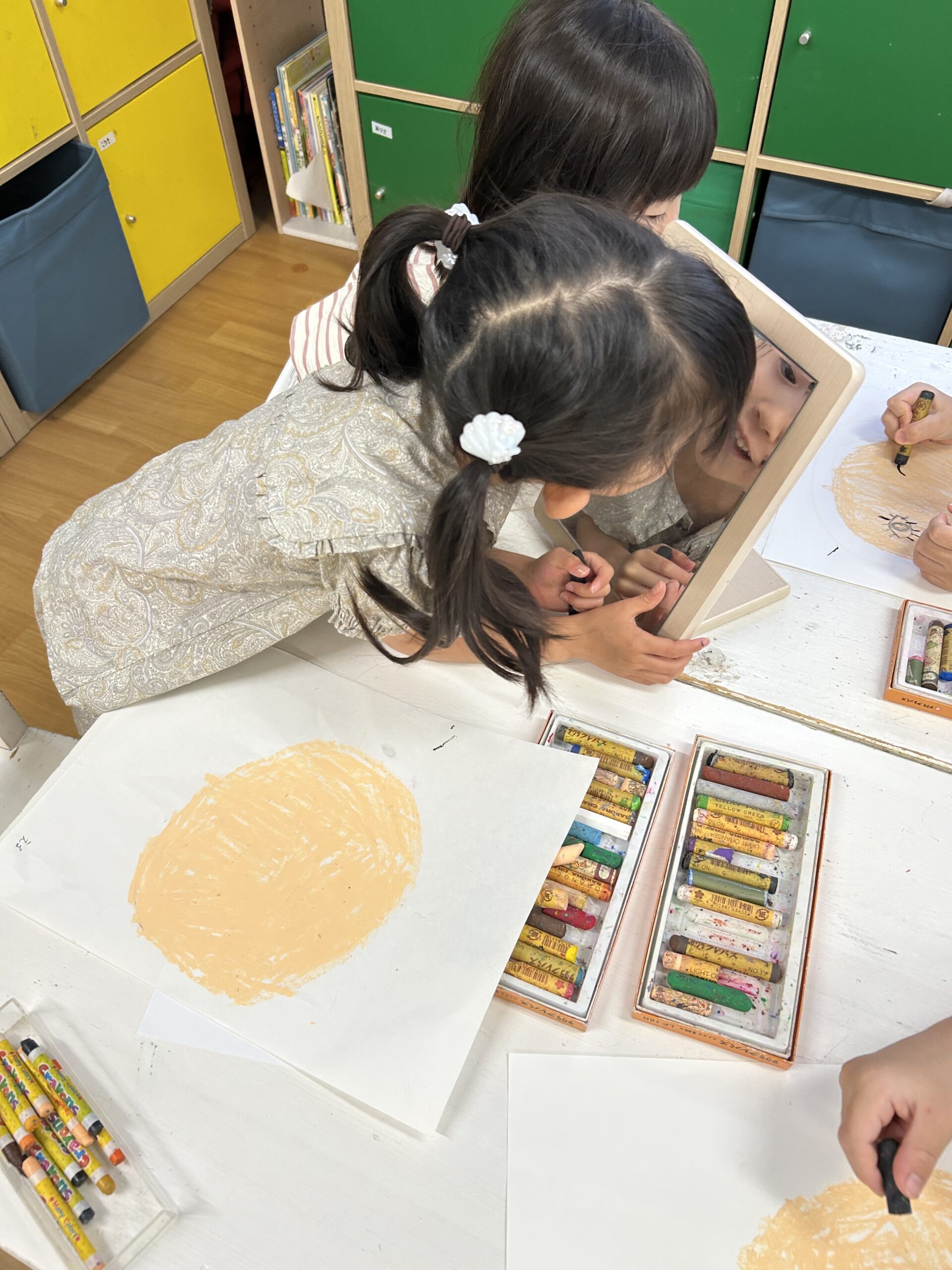 鏡と睨めっこしながら、自分の顔をじっくり観察👀眉毛もあるね、まつ毛は下にもあるね、などと言いながら、顔の形や髪型などもしっかり見て、特徴を捉え完成させました。