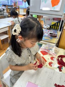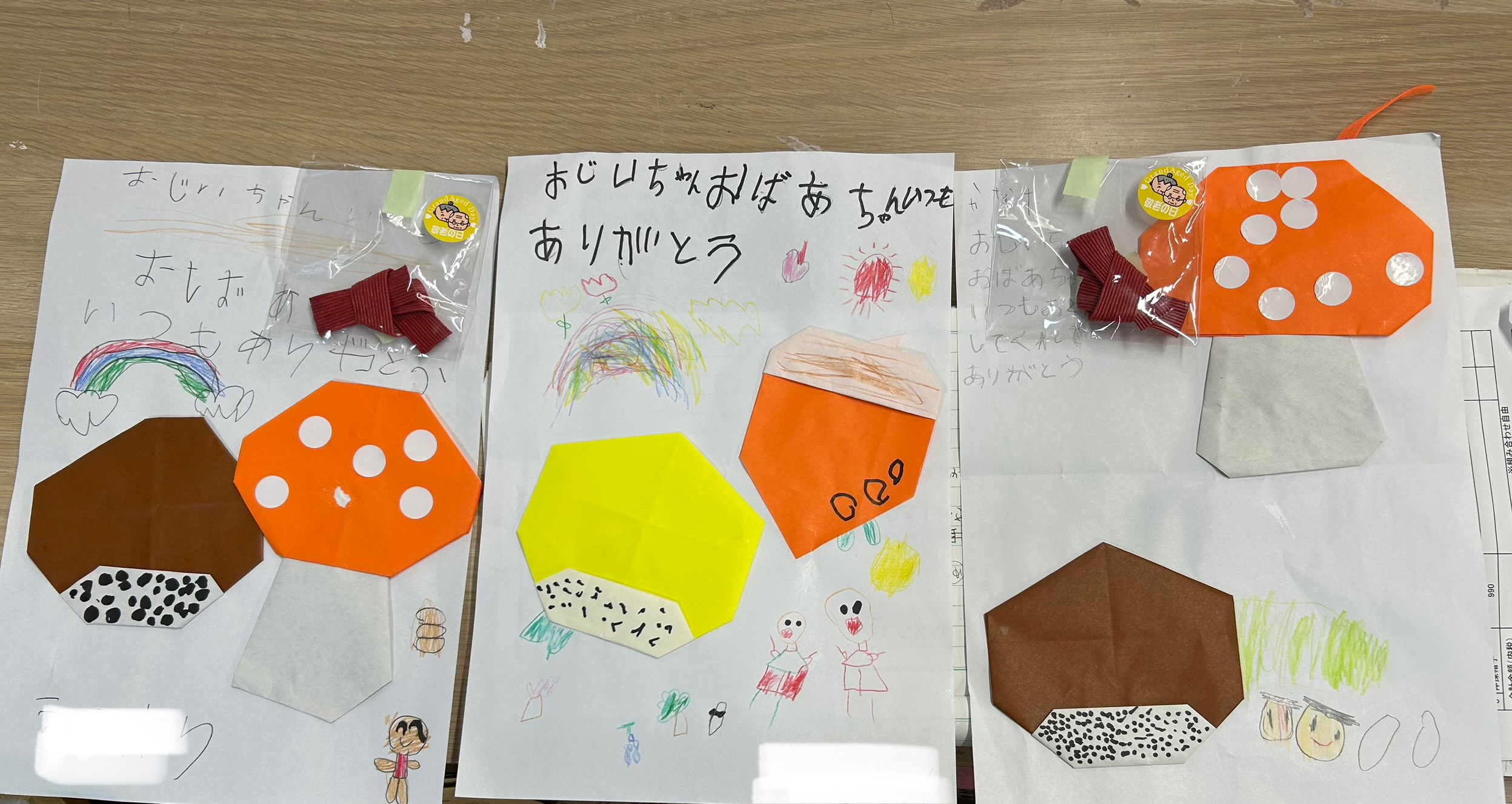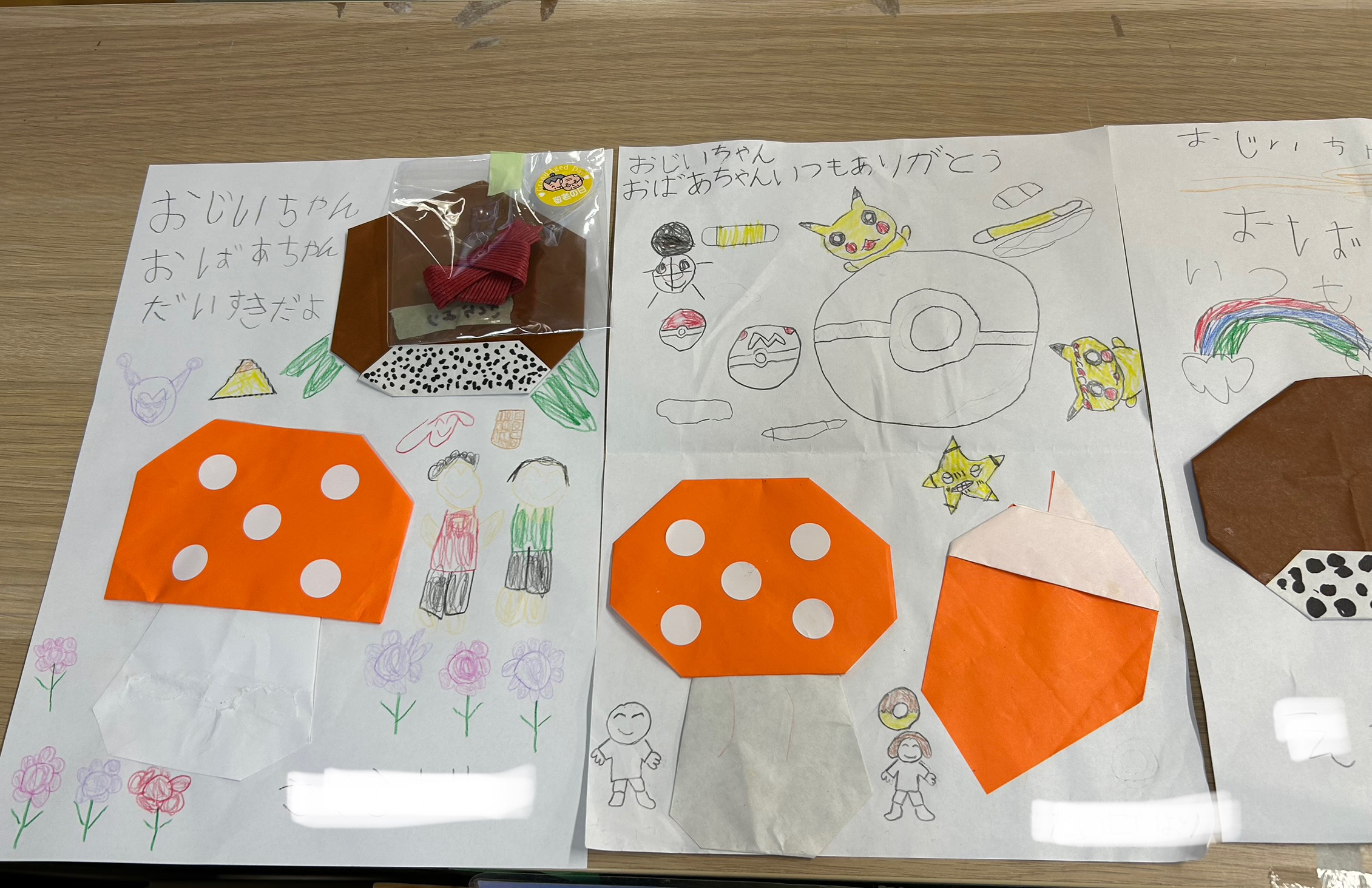 9月15日は敬老の日🥰 お仕事の中で、プレゼントコーナーを作りました。季節の折り紙を折り、お手紙を書いたり、ペーパークラフトを利用して「結ぶ」手作業で、箸置きを作ったりしました(^^) バックの絵もいろいろ☺️ おじいちゃん、おばぁちゃんの顔を描いたり、鉛筆を何本か一緒に持ち、虹を描いたりと工夫して描いていました♡ 日頃の感謝の気持ちを込めて☺️