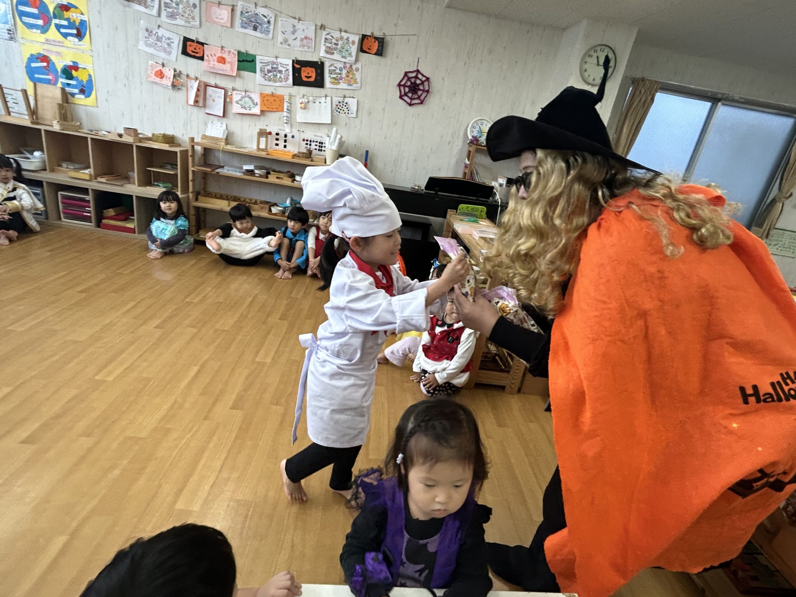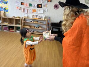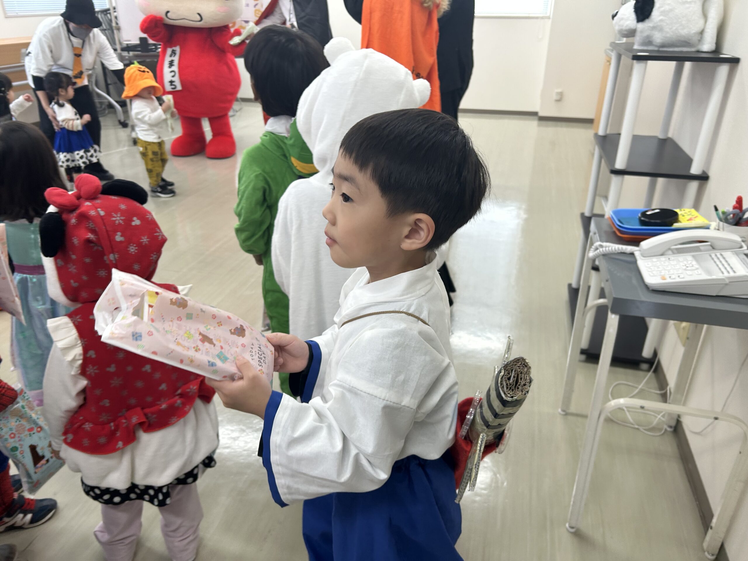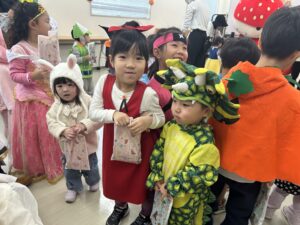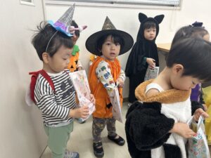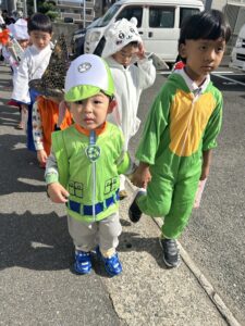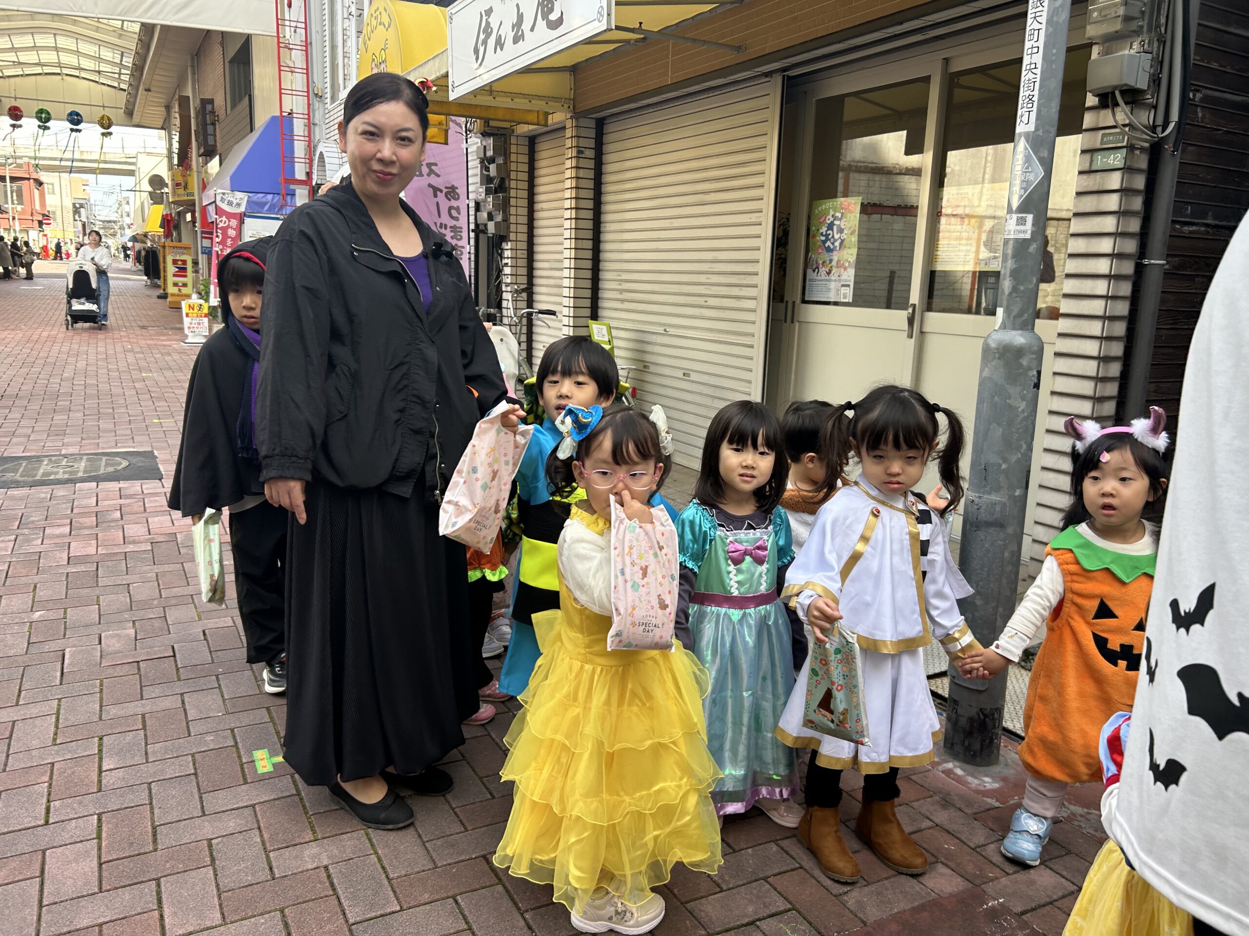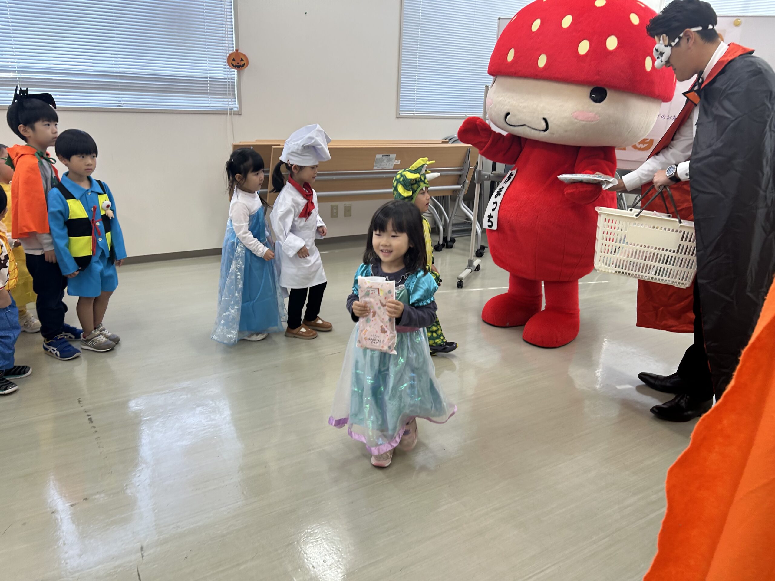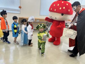 福岡特産のあまおうキャラクター「あまっちくん」からハロウィンのおやつをもらいました🍓💕みんなあまっちくんに会えて大喜び!商店街でも「かわいいね〜!」と声をかけてもらい、嬉しそうに笑顔で手を振り返す子どもたち(^^)
