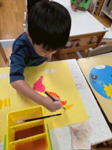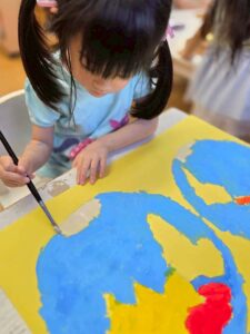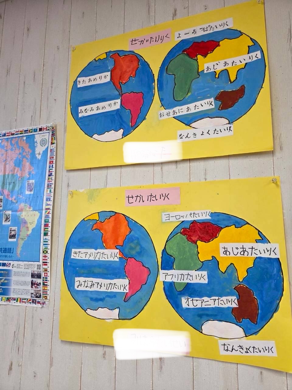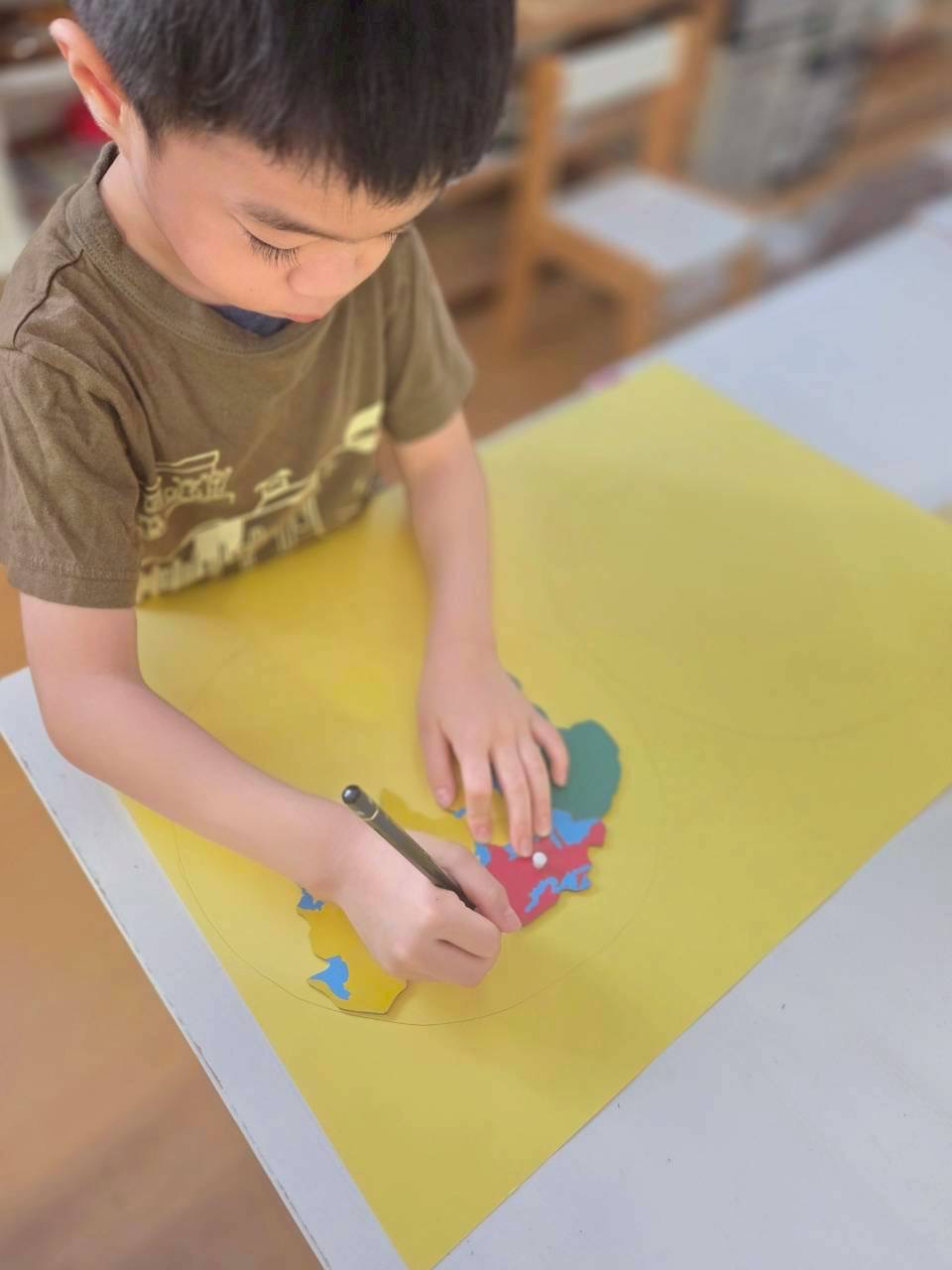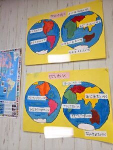 平面地図パズルを使って、大陸名を加えた絵を描いている年長さん達。
