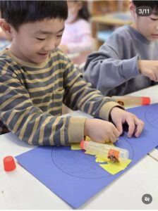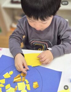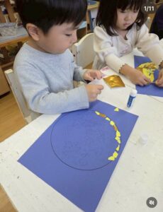 そこで、スカイクラスの子ども達と、ちぎり絵で大きなスーパームーン🌕をつくりました。