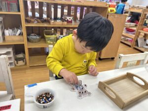 小さな手で、小さなアイロンビーズを上手につかみ、はめ込んでいます。
