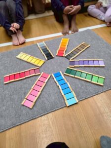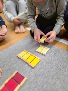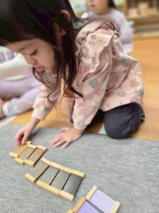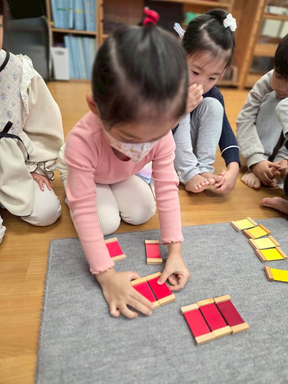 微妙な色の違いを見分けるこの教具は、子ども自身の「よく見る力」を育てる感覚教育の一つ。大人でも迷ってしまう違いに、子どもたちは集中して向き合い、比較・判断する力を養っています✨