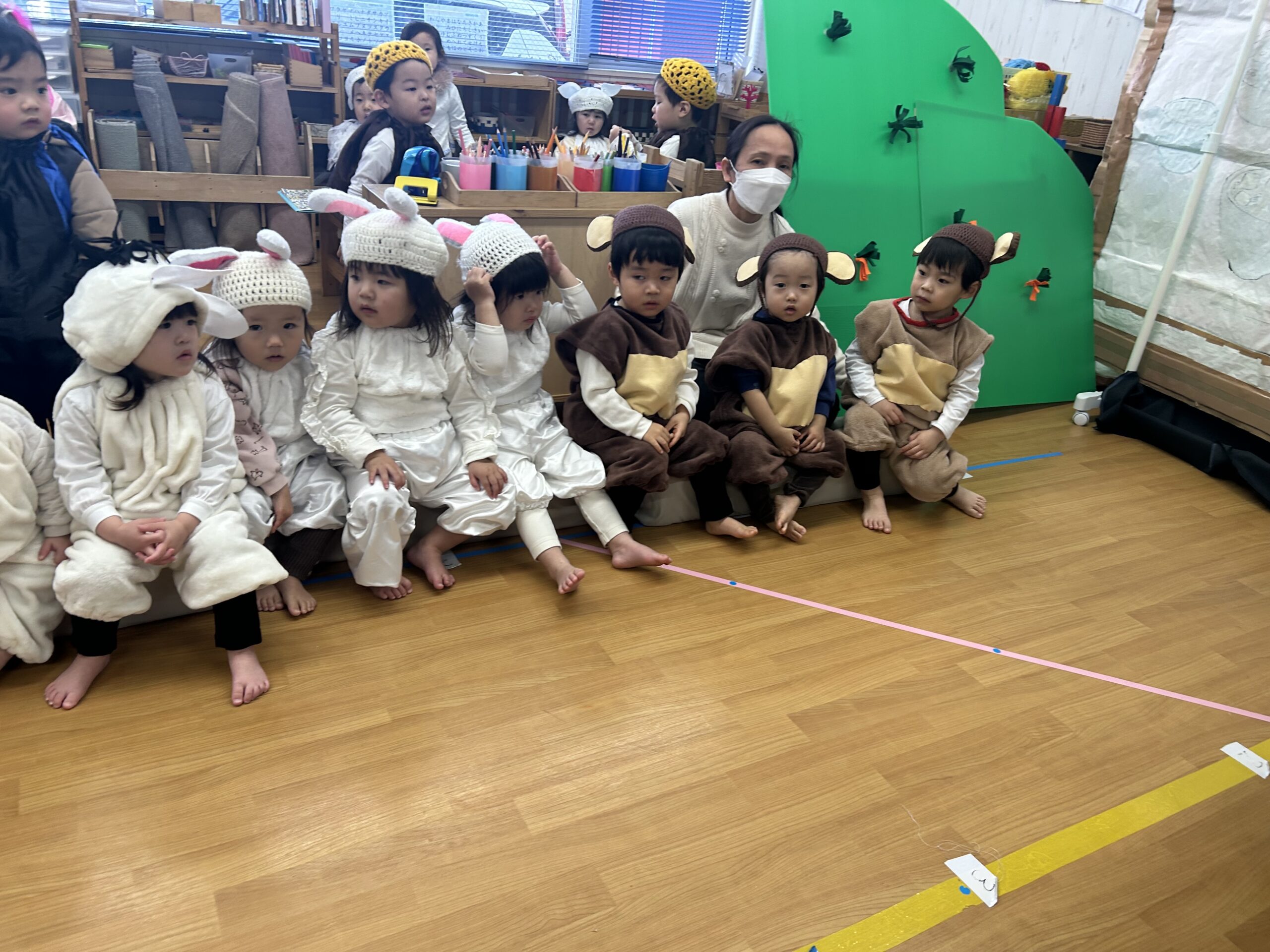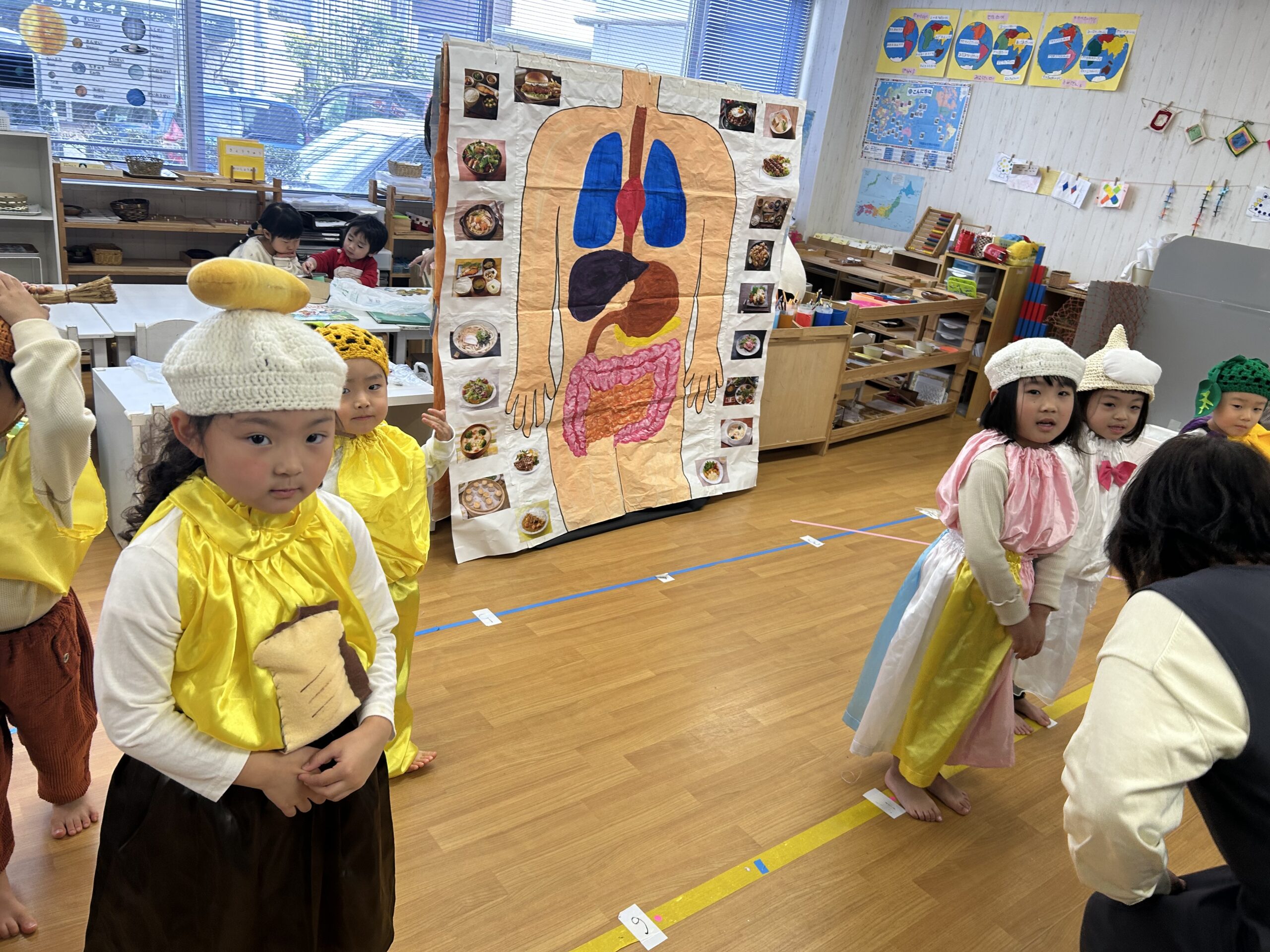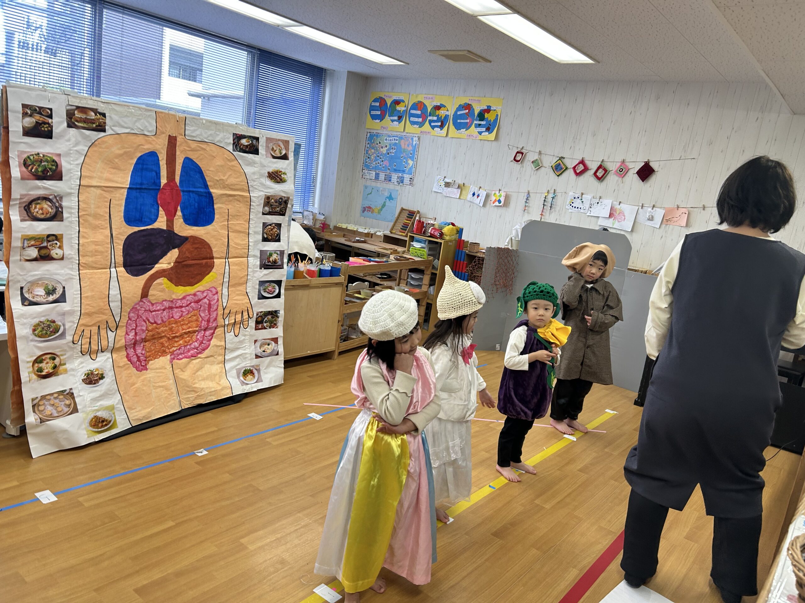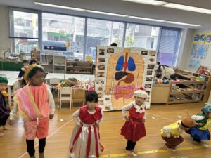 スカイクラスの生活劇では、自分のセリフやお友達のセリフも覚え、順番を理解したり、グループ内で教えあったりする姿が見られていました。子ども達のすぐに吸収する力に驚く毎日です♪よく、お話も聞けています☺️