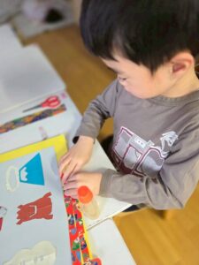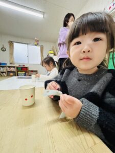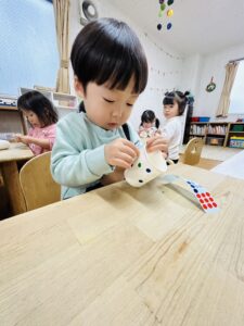 スカイクラスは、朝の会で、お正月にまつわるお話(おせち、お年玉、初詣、お正月遊び、干支🐎)を聞いたり、実際にコマ作りをしてお正月遊びを楽しみました!