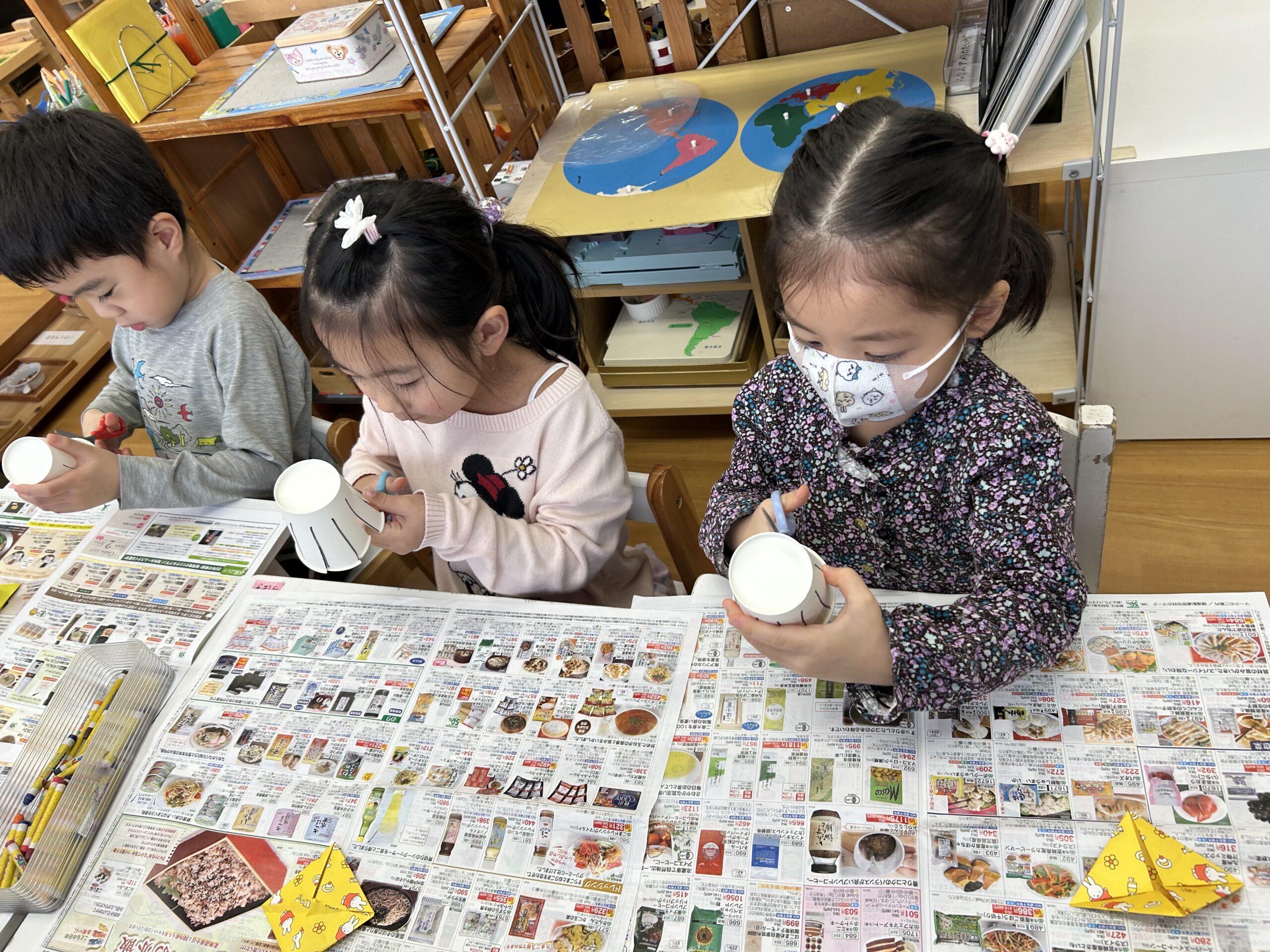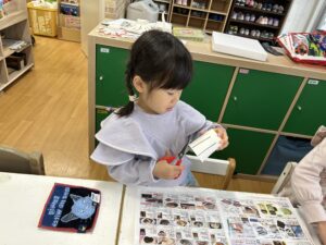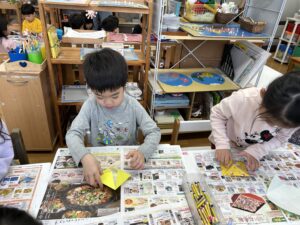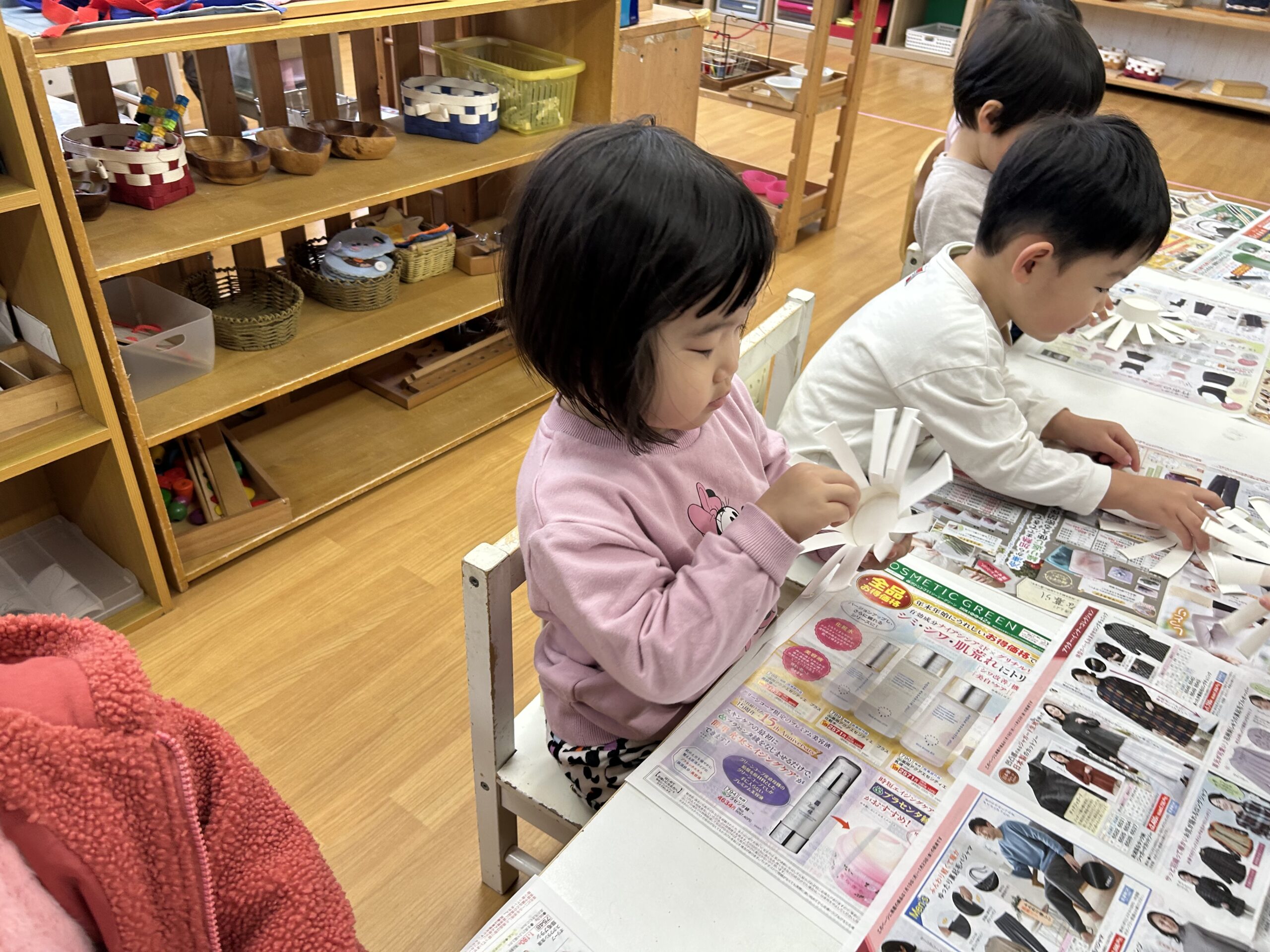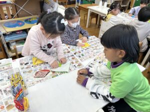年末に、年長さんと冬期コースできている小学生が凧や、富士山、干支などの切り紙制作を行いました。