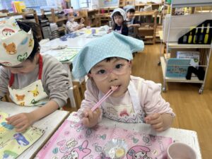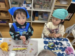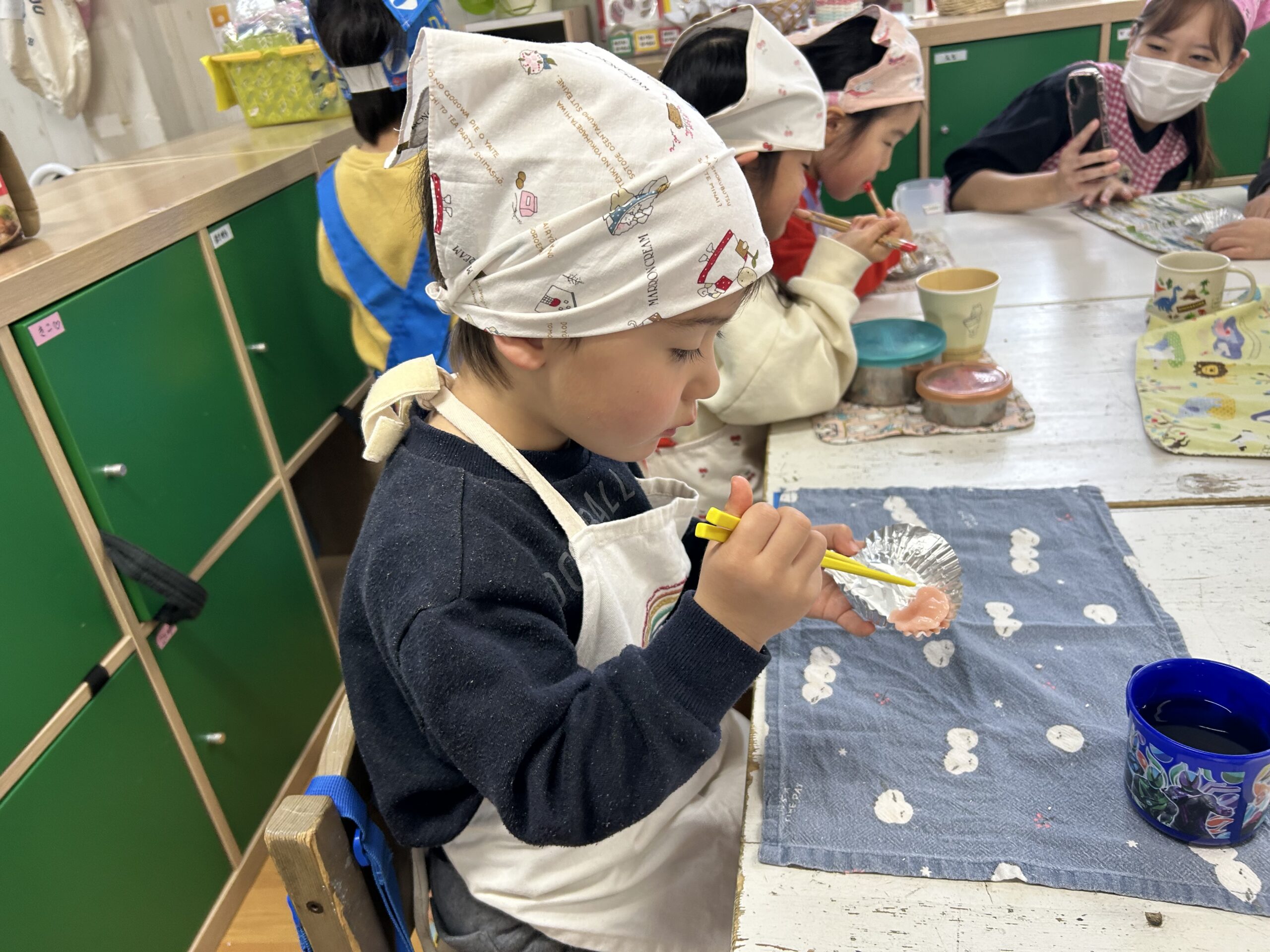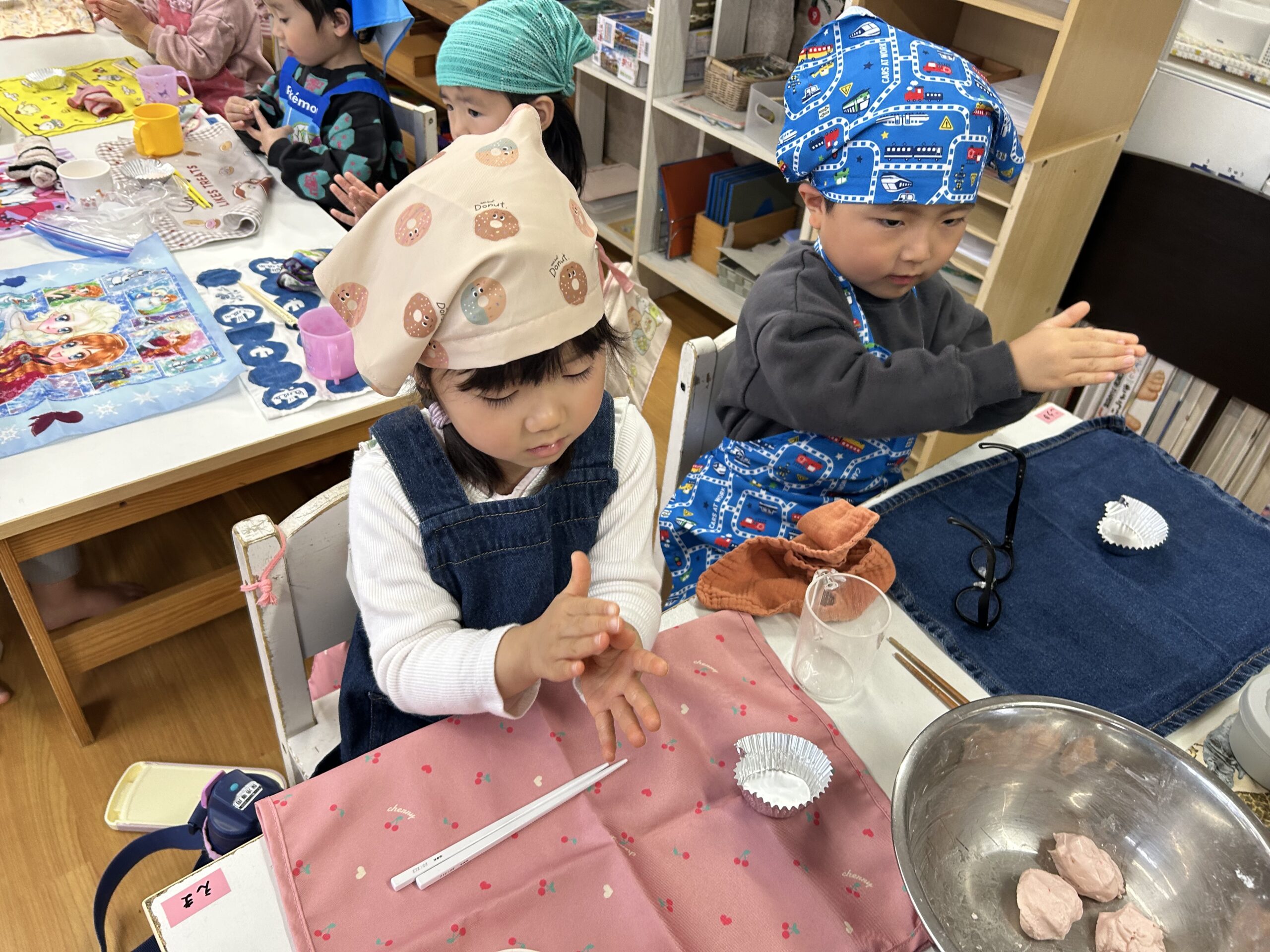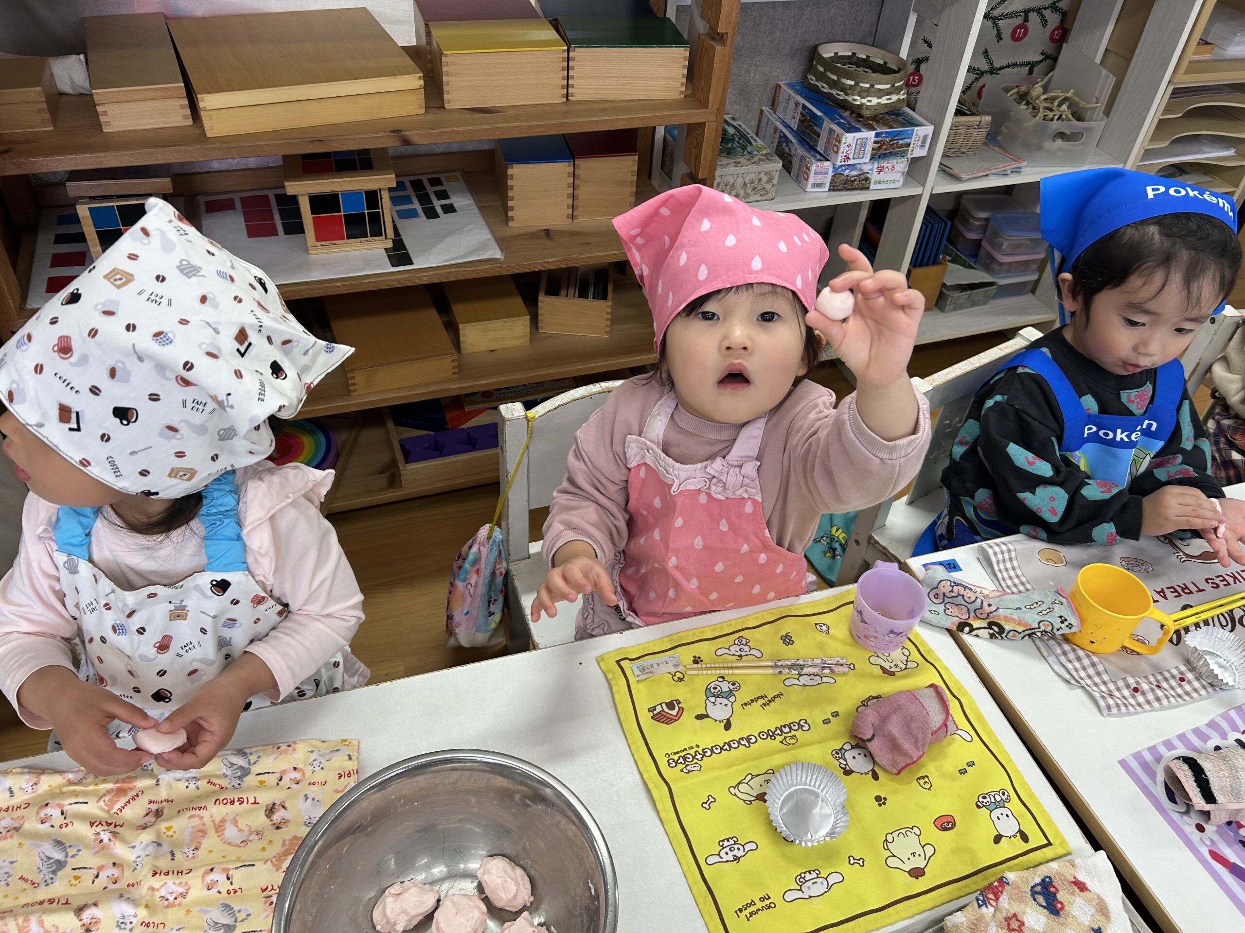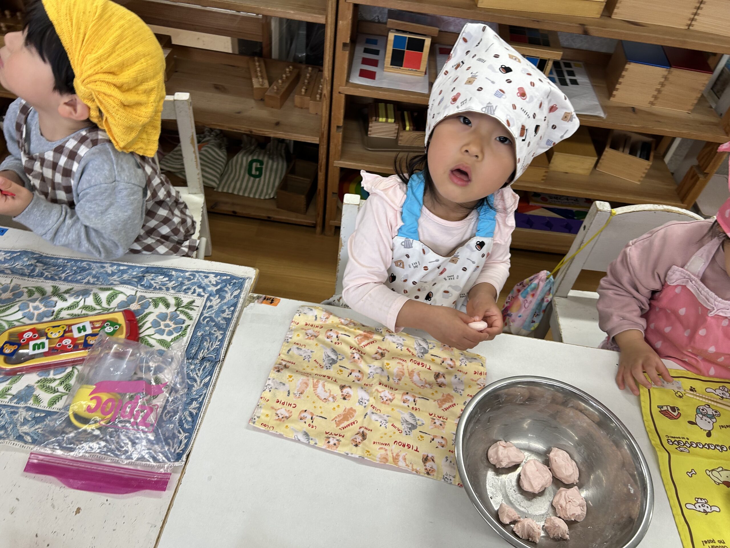 3月3日ひなまつり🎎 スカイクラスは、2色団子🍡クッキングをしました!朝からみんな楽しみにしていて、エプロン、三角巾を嬉しそうにつけて準備万端!