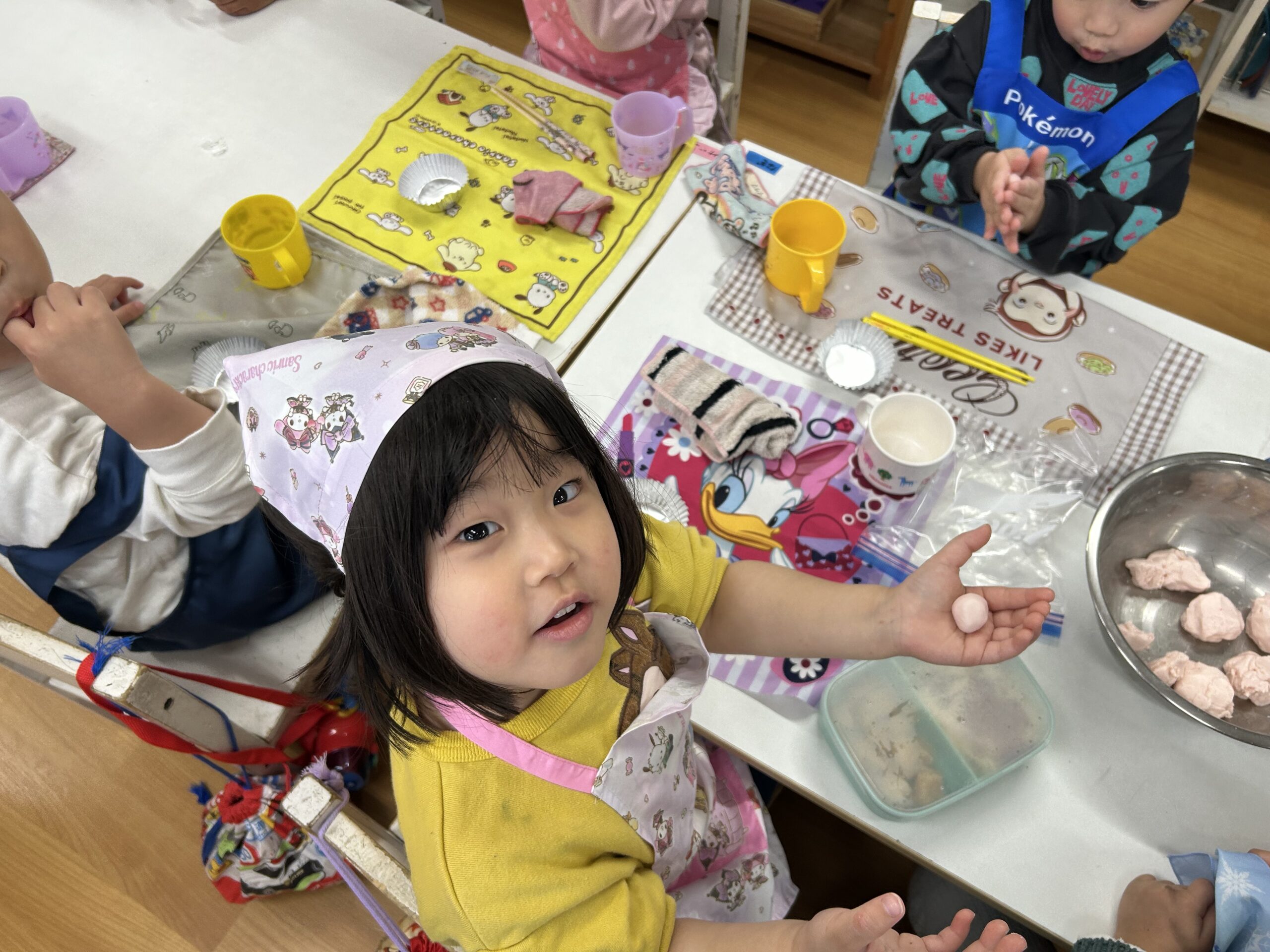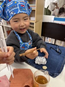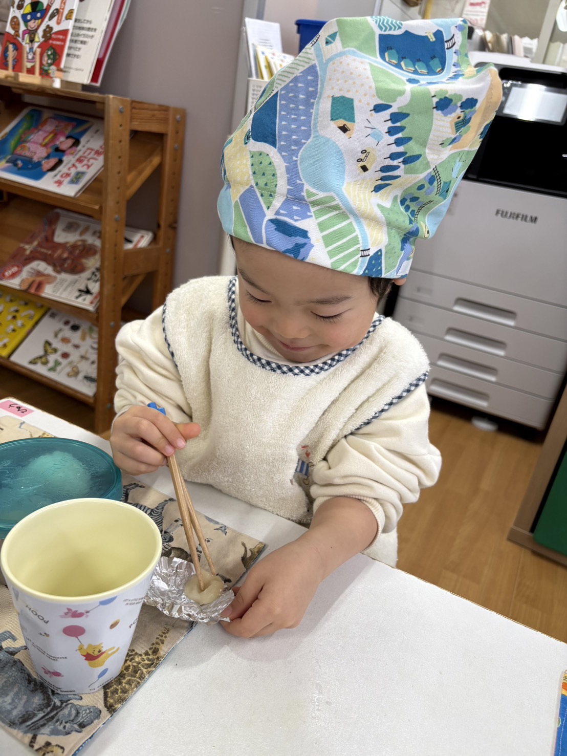 出来上がったお団子を「おいしい〜♡」と嬉しそうに食べていました。
