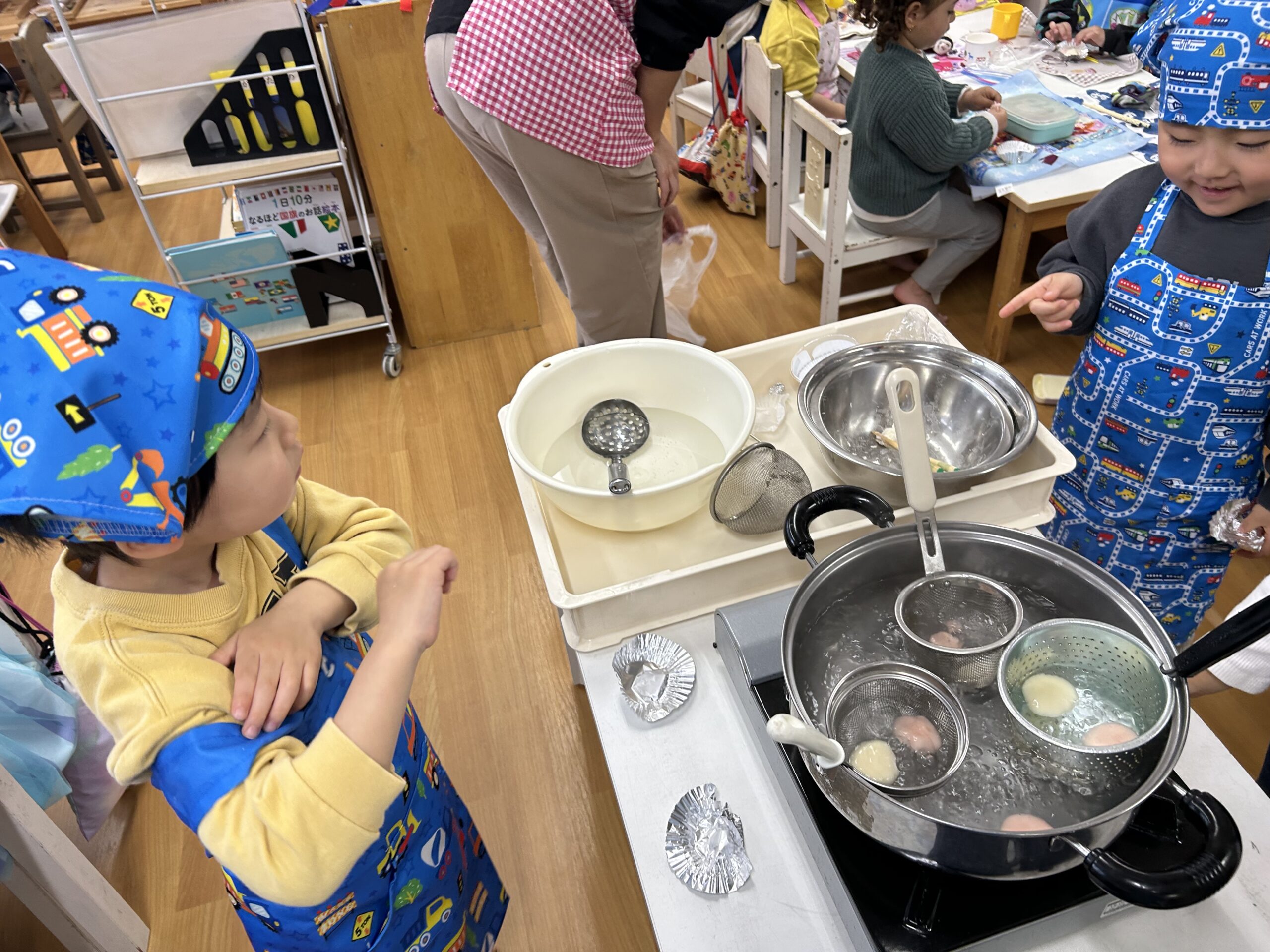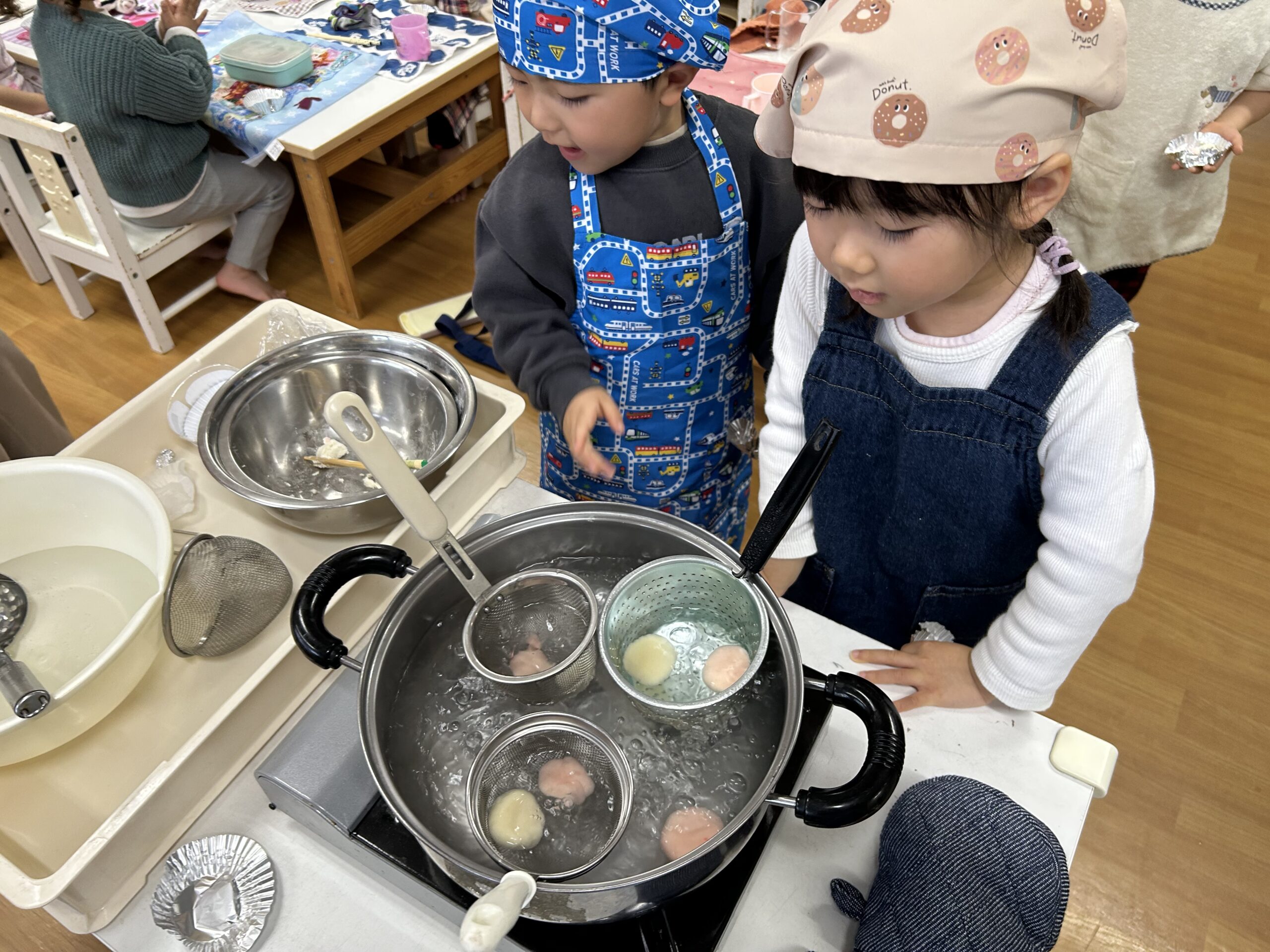 お団子を手のひらで丸めて、つぶして、茹でました(^^) 「お団子は、白玉粉とお豆腐で作るよ、何の仲間かな?」と聞くと「赤の仲間!ヤッー!」と答える子ども達。食育に取り組んだ成果が出ていました👏😉